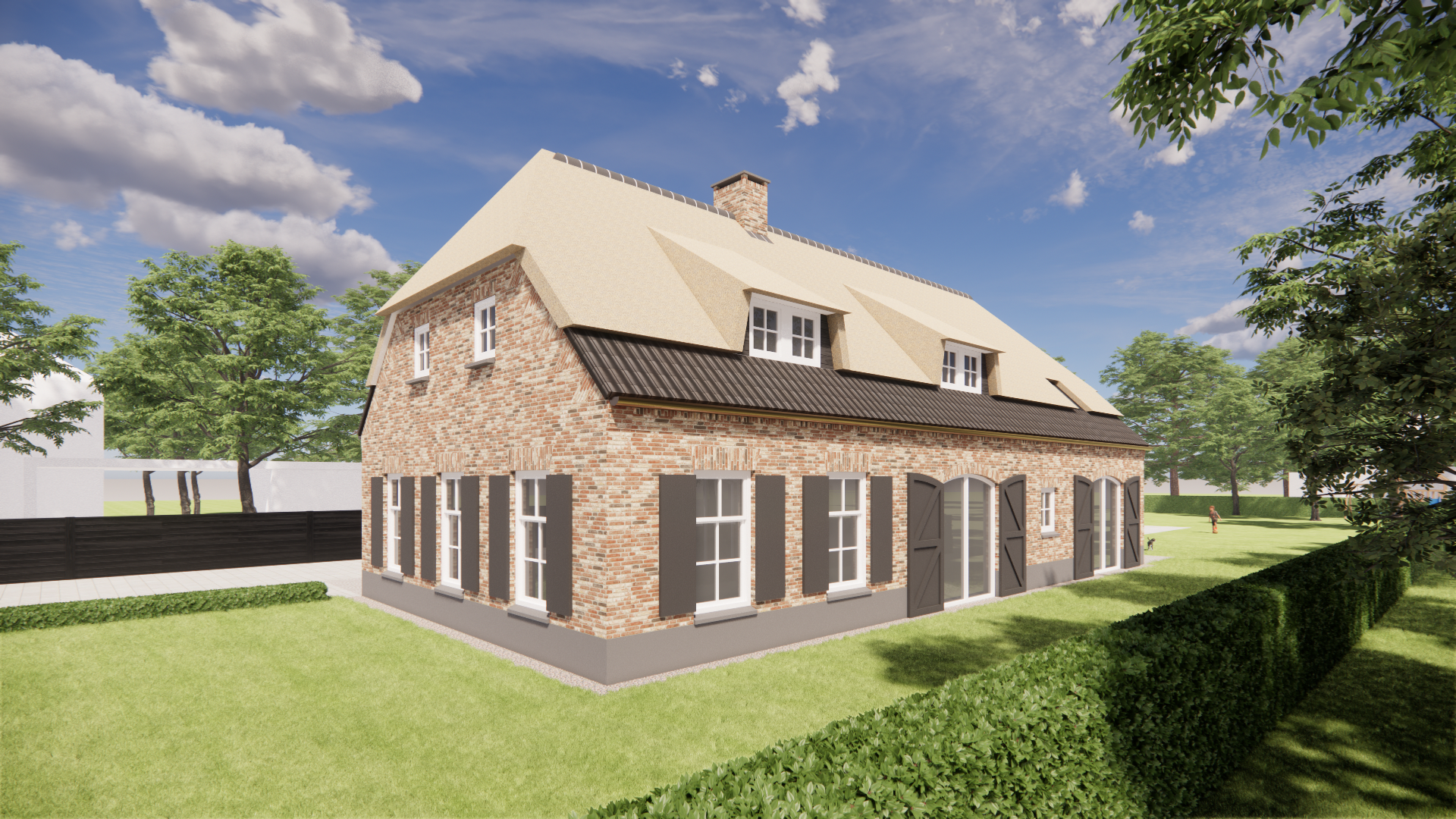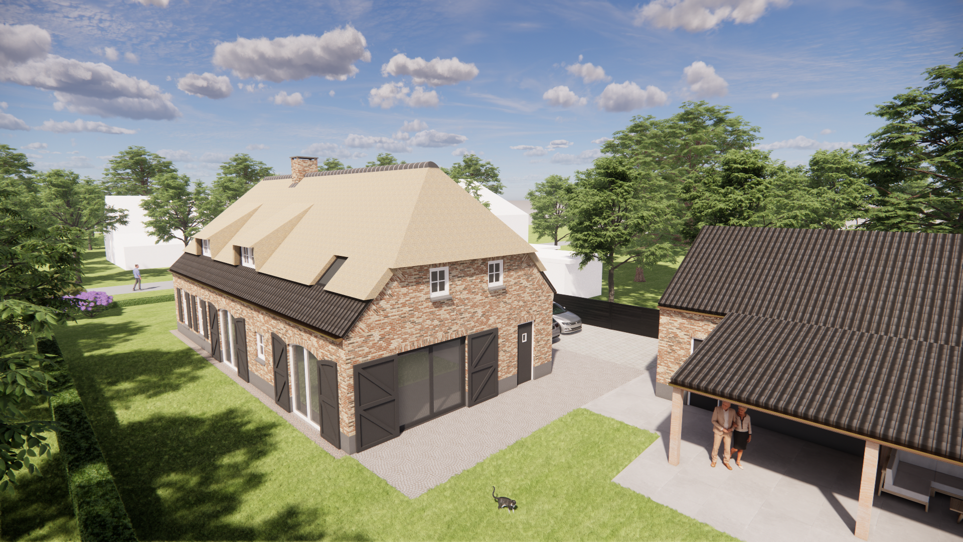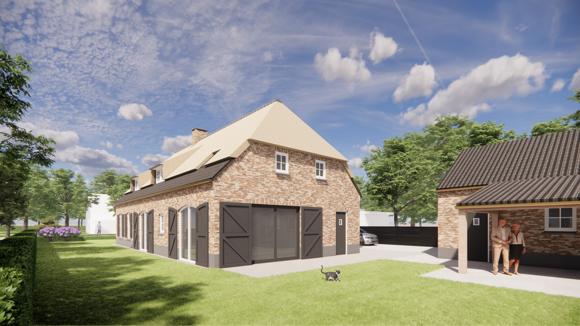 Een eigentijdse interpretatie van boerderijarchitectuur met een rieten wolfsdak als warm gebaar. De bruine metselwerkgevel staat stevig op een zorgvuldige cementplint. Luiken, een dakkapel en een schoorsteen geven ritme en herkenning. Tijdloos en uitnodigend.