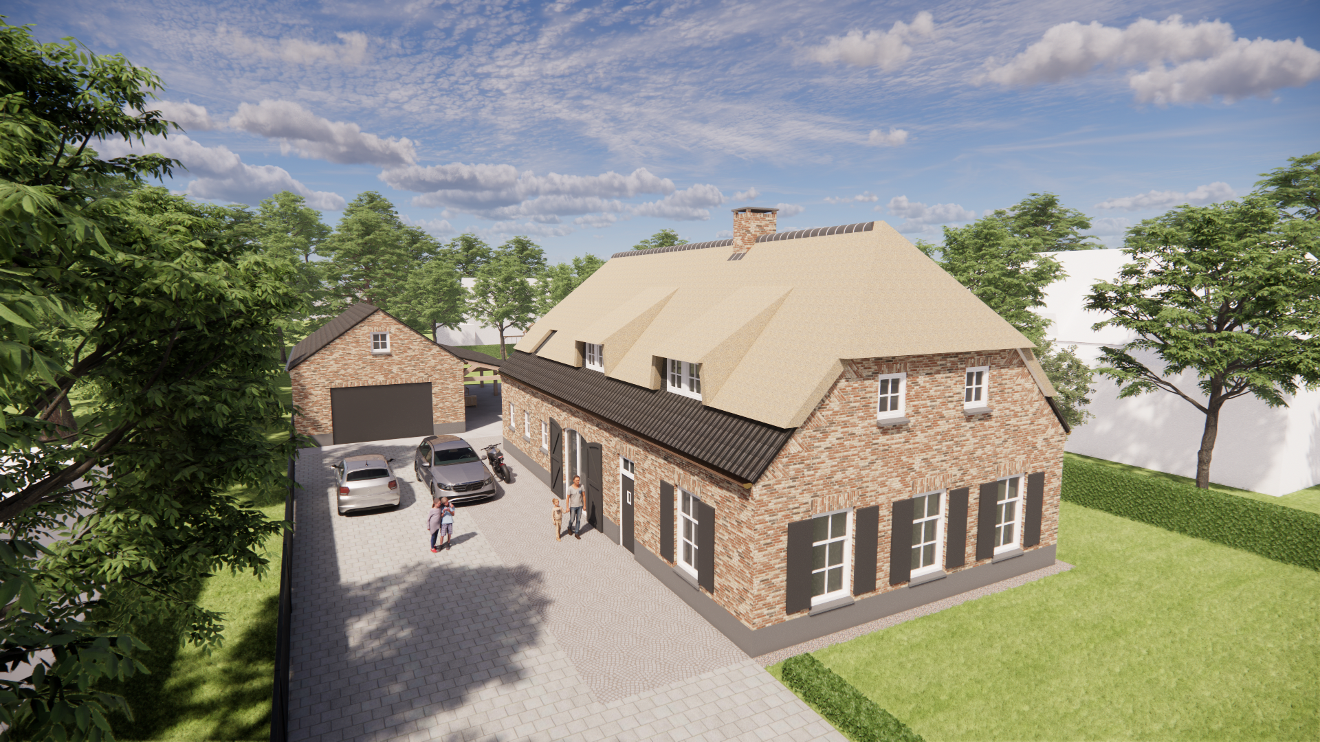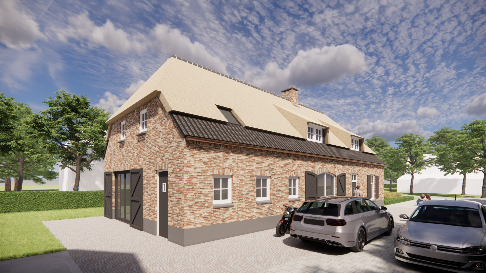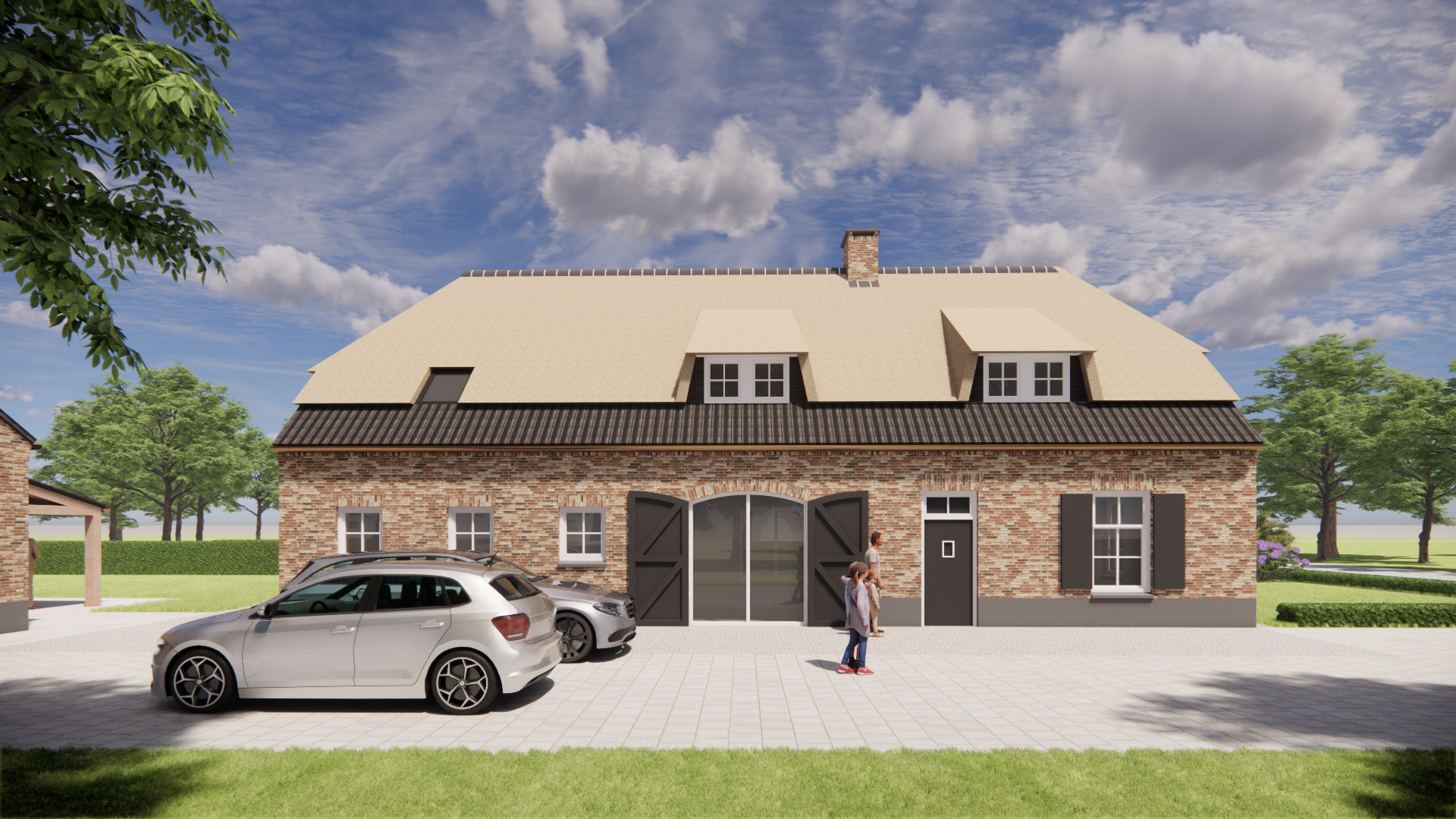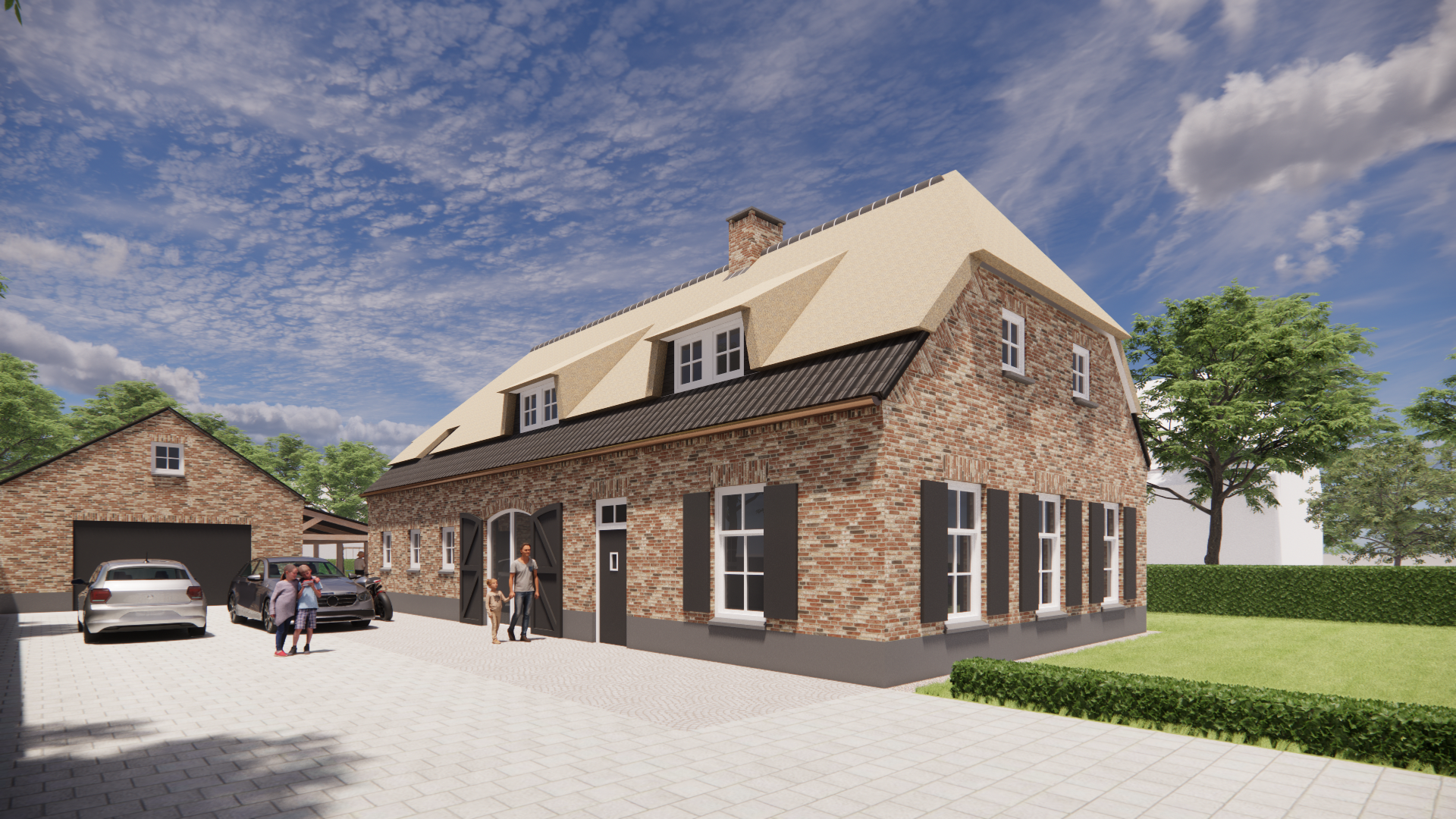 Een eigentijdse interpretatie van boerderijarchitectuur met een rieten wolfsdak als warm gebaar. De bruine metselwerkgevel staat stevig op een zorgvuldige cementplint. Luiken, een dakkapel en een schoorsteen geven ritme en herkenning. Tijdloos en uitnodigend.
