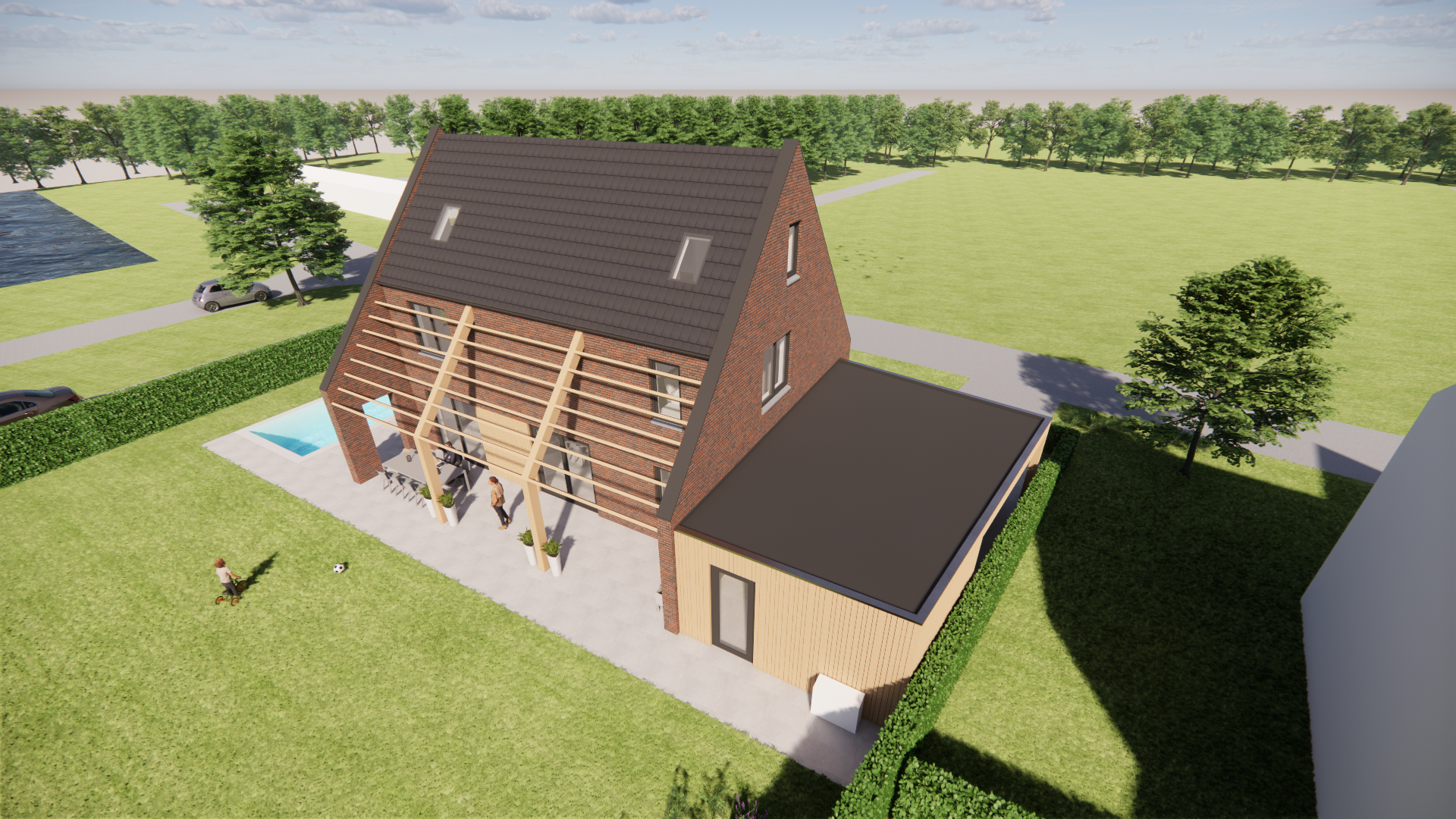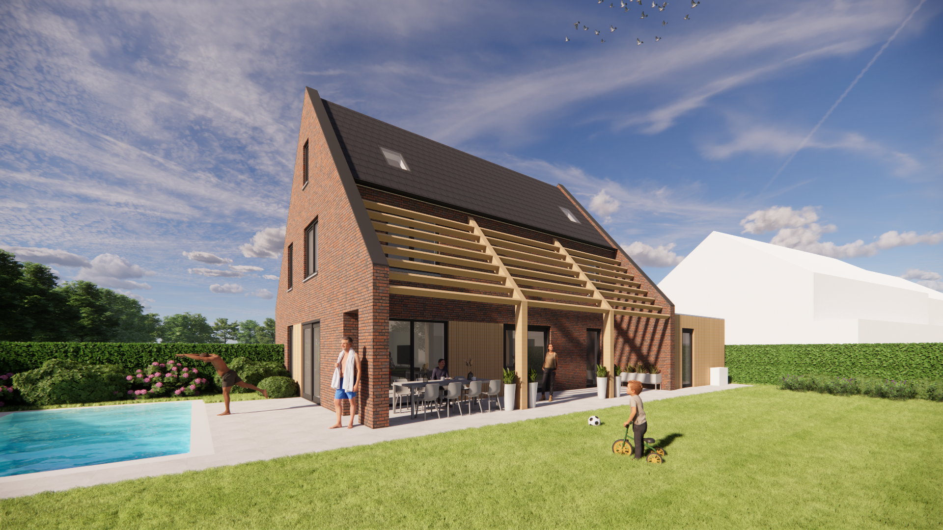 Dit nieuwbouw project toont een vrijstaand woonhuis in moderne eigentijdse stijl. Rood metselwerk vormt het krachtige silhouet, met een strak zadeldak van vlakke dakpannen. De verholen dakgoot houdt de lijnen rustig en precies. Houten accenten en buiten aanwezige balken brengen warmte en tactiliteit. De kap ligt in de breedterichting, wat het volume een uitgebalanceerde uitstraling geeft.