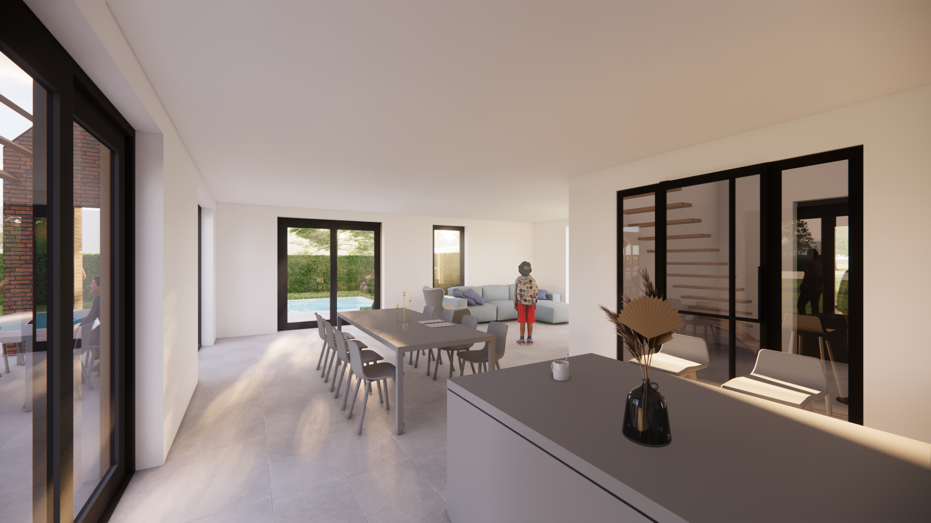 Je stapt binnen via een hal met vide, meteen meer licht en meer ruimte. De leefruimte voelt ontspannen en overzichtelijk, met een keuken met kookeiland als hart. Een vaste trap brengt je comfortabel naar de zolder. Er is ook een aparte speelkamer, zodat er altijd plek is voor rust of juist energie.