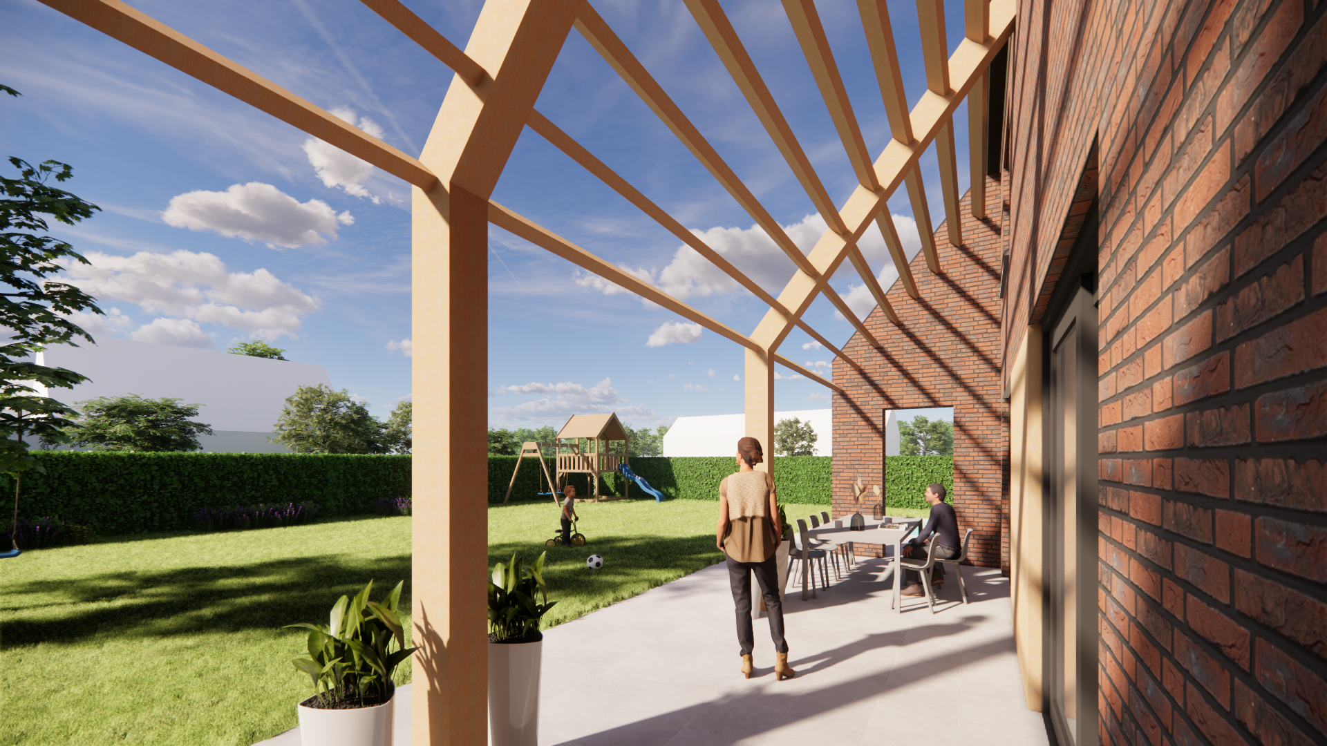 Buiten is het comfortabel en praktisch. Een carport biedt beschutte parkeerruimte. Het zwembad voegt beleving toe aan het dagelijks leven. Hout en rood metselwerk sluiten ook buiten mooi op elkaar aan, voor een rustig en samenhangend geheel.