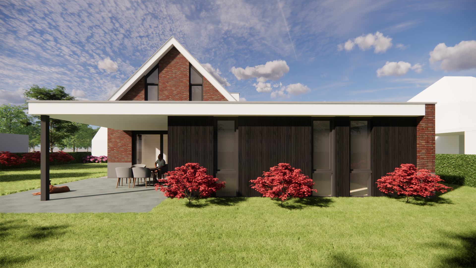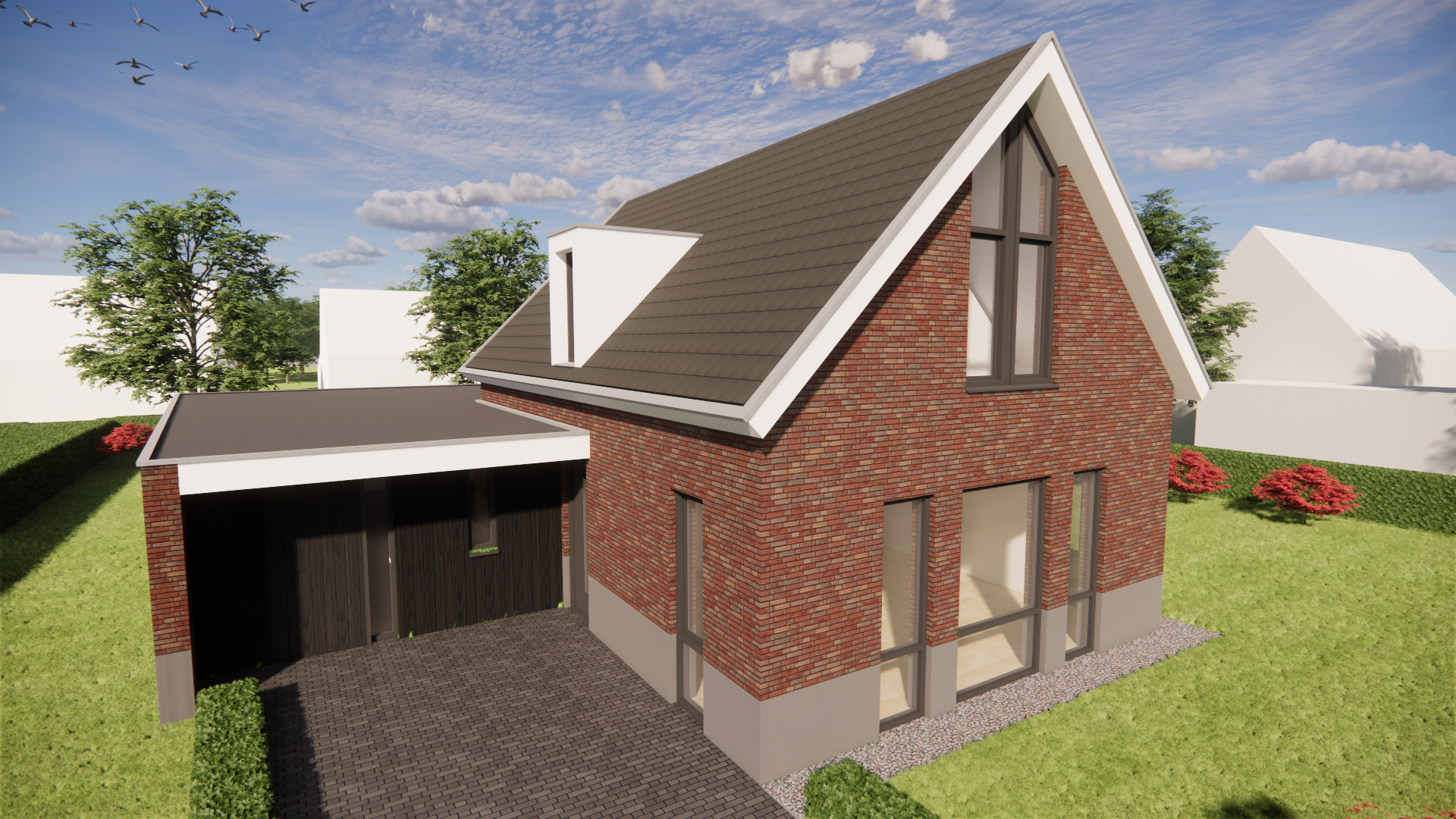 Deze nieuwbouw laat een moderne eigentijdse vormentaal zien in een traditioneel gebouwd, vrijstaand huis. Rood metselwerk draagt het beeld, met een zadeldak met gegolfde dakpannen als rustige kap. Strakke details zoals de verholen dakgoot, het dakoverstek en een cementplint zorgen voor een verfijnde rand. Een dakkapel voegt ruimte en daglicht toe, terwijl houtaccenten warmte en karakter brengen. De overdekte entree geeft een uitnodigende eerste indruk.