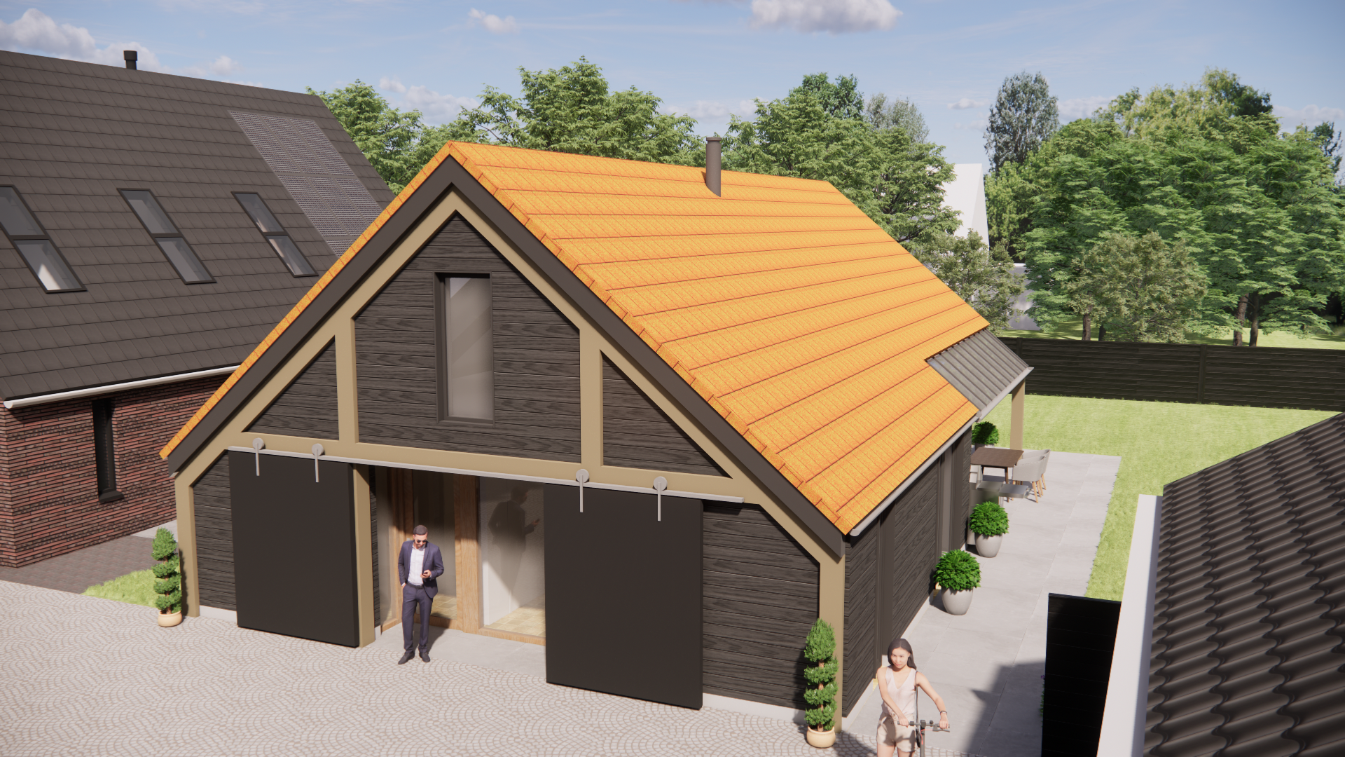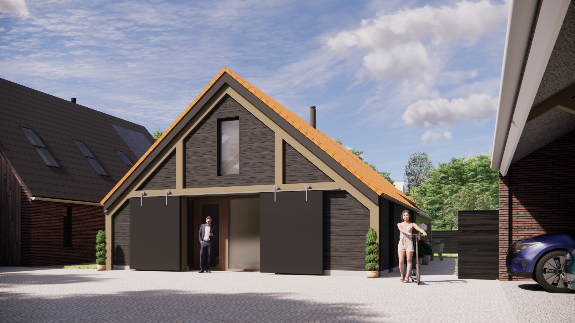 Vrijstaande schuurwoning met houten gevel, zadeldak met vlakke dakpannen en overdekte entree
