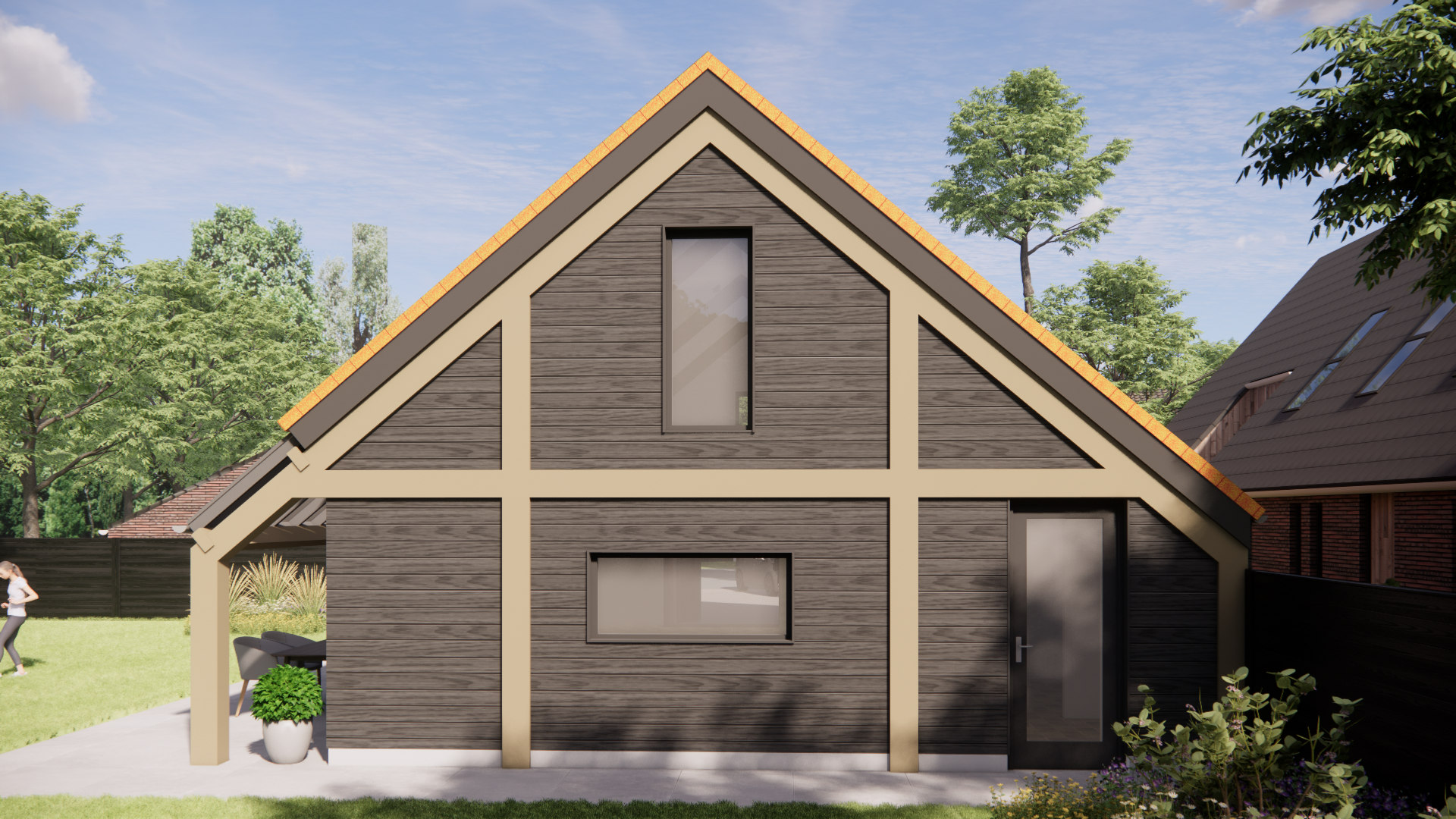 Nieuwbouw van een vrijstaande schuurwoning. De houten gevel en het zadeldak met vlakke dakpannen bepalen het beeld. De houten balken buiten en de cementplint geven duidelijke accenten. De overdekte entree en de overkapping zorgen voor een prettig welkom en een beschutte plek buiten.