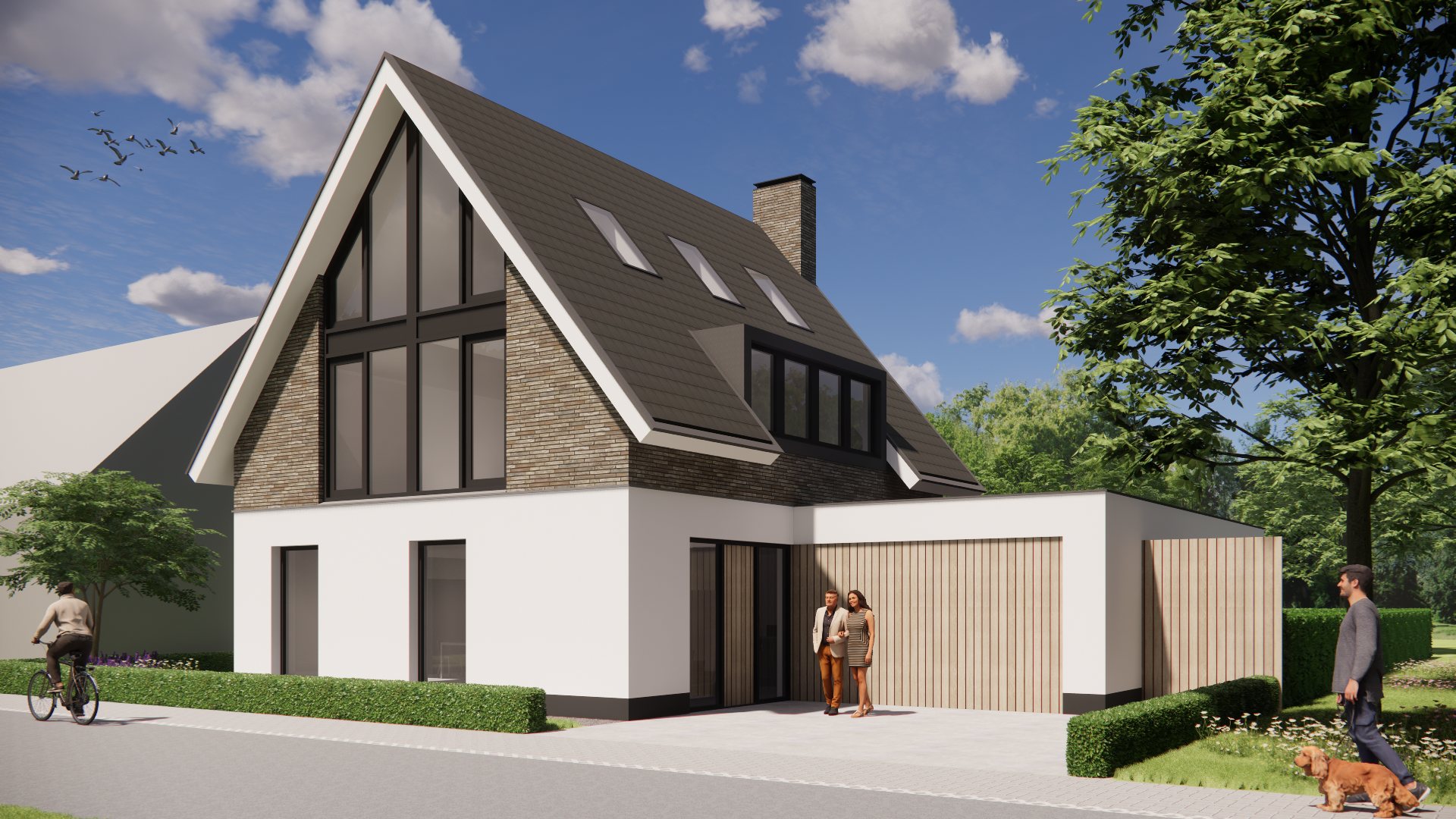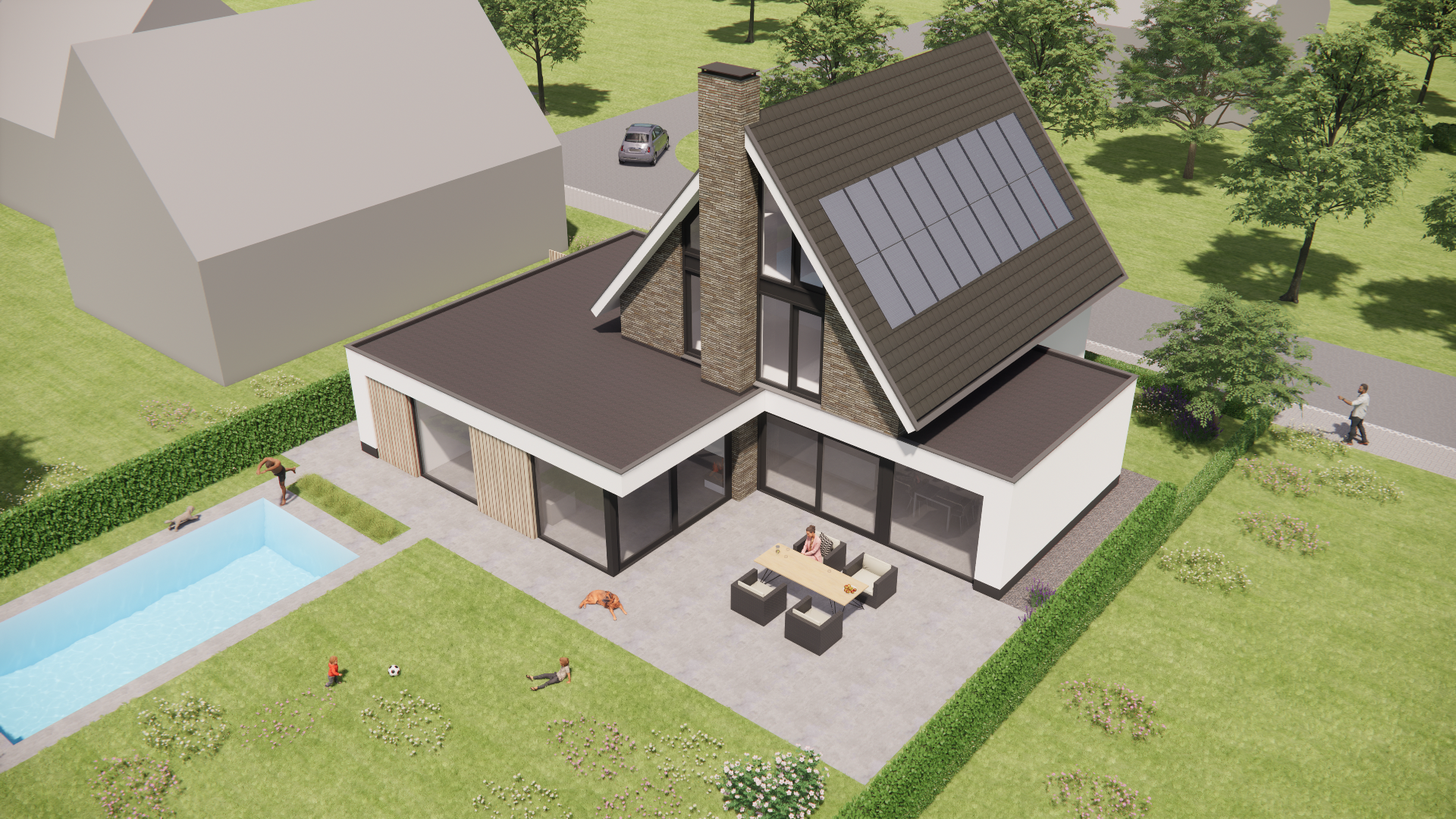 De kracht van dit ontwerp zit in de balans tussen eenvoud en detail. De dakkapel, schoorsteen en het zorgvuldig vormgegeven lijnenspel van de gevel zorgen voor een harmonieus geheel. Het zwembad in de tuin maakt het plaatje compleet: een woning die rust en luxe uitstraalt, zonder te overdrijven.