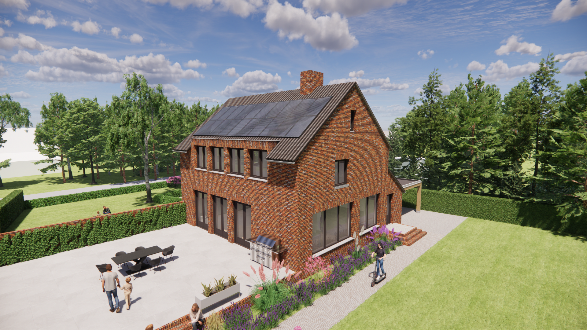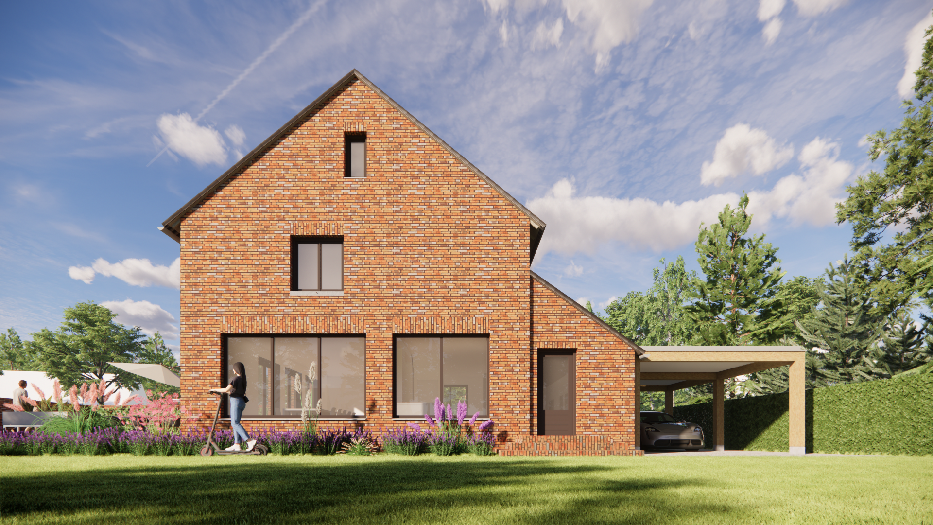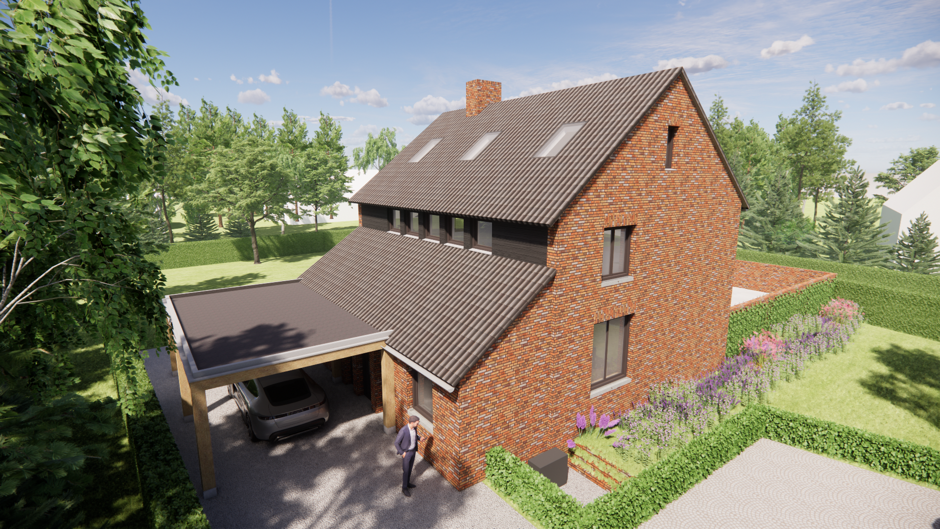 Deze verbouw laat een modern eigentijds gezicht zien binnen een vertrouwd, traditioneel jasje. Het vrijstaande woonhuis combineert rood en bruin metselwerk met een zadeldak in gegolfde dakpannen. De dakkapel en de schoorsteen geven de kap een helder profiel. De kap is georiënteerd in de diepte, wat het langgerekte silhouet versterkt. De carport voegt praktische buitenruimte toe.