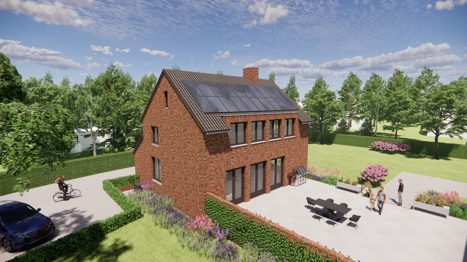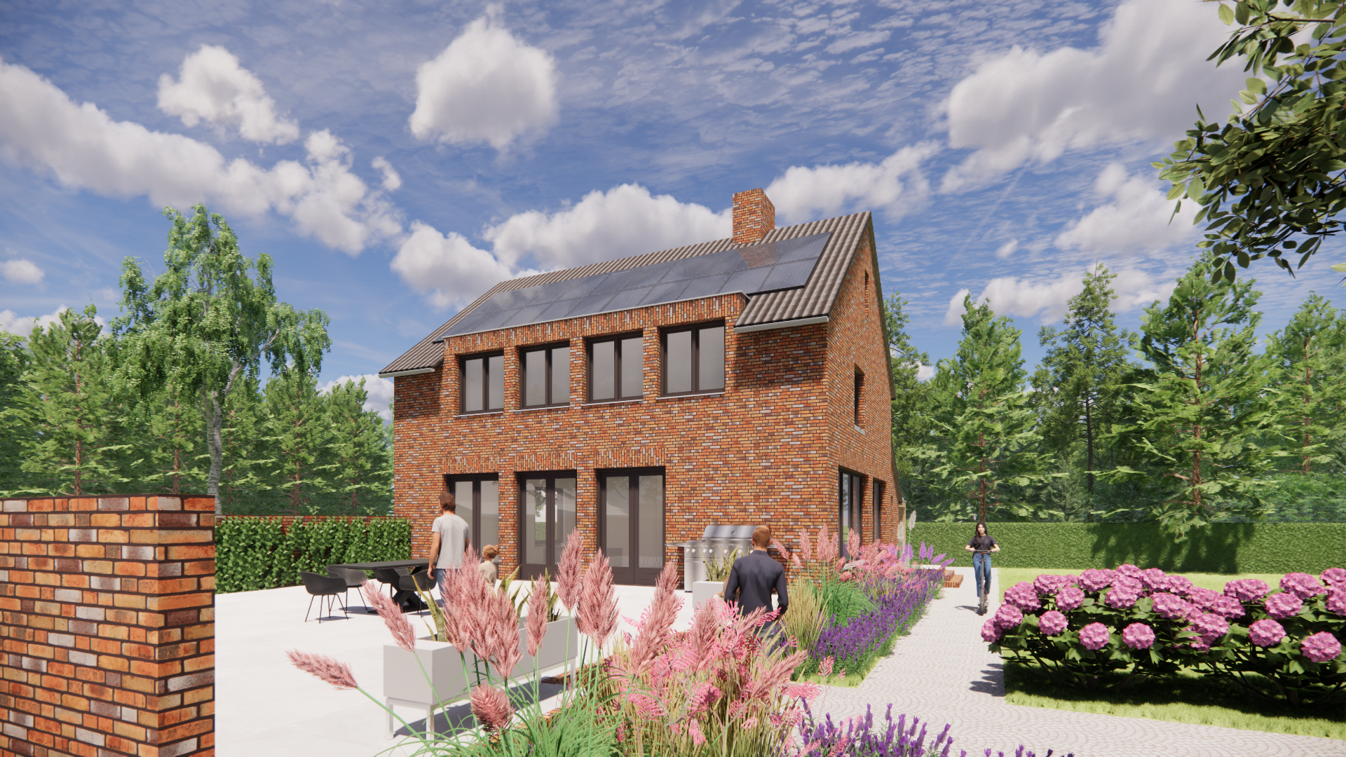 Het metselwerk in rood en bruin geeft de woning stevigheid en warmte. Het zadeldak met gegolfde dakpannen sluit aan op de context, terwijl de dakkapel en schoorsteen het silhouet ritme en herkenning geven. Eigentijdse keuzes, traditioneel uitgevoerd, voor een resultaat dat lang meegaat.